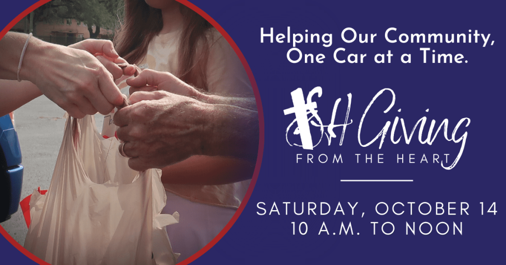 In our continued effort to meet the growing needs of our community, Sacred Heart is holding its latest Giving from the Heart drive-through donation event on Saturday, October 14, at the North Campus from 10 a.m. to noon. Volunteers will be gathered to receive items assisting our Hands of Hope ministry, and the Society of St. Vincent de Paul.