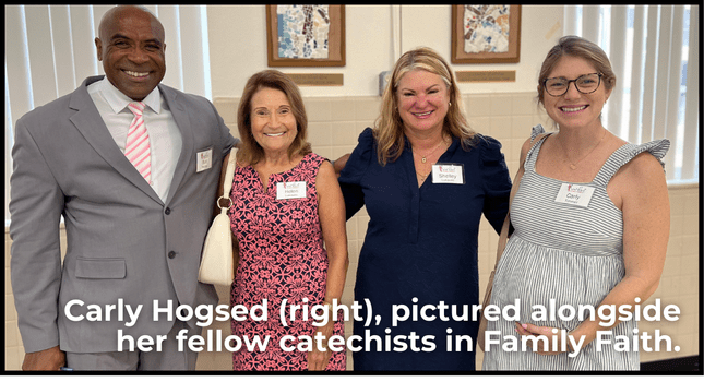 “I wanted to find a way to connect with other parishioners to make our church feel more like a home,” says Carly Hogsed, when asked what led her to assist the parish as a catechist. “The best way to do so I have always found is to get involved! I think having both the parents and the children sitting together for faith formation lessons will have long lasting positive impacts for their child’s faith journey.”