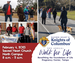 Sacred Heart’s Knights of Columbus Council #12110 will host their third annual Walk for Life on Saturday, February 4 from 8-11 a.m. at the North Campus (3515 N. Florida Ave.).