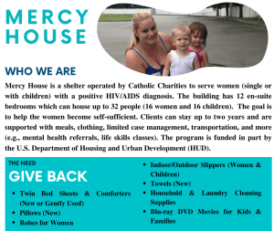 Open Doors is excited to partner with Catholic Charities and their Mercy House shelter for our upcoming drive. Mercy House serves women (either single or with children) with a positive HIV or AIDS diagnosis. The shelter has 12 en suite rooms, housing up to 32 people. The shelter is partially funded by the U.S. Department of Housing and Urban Development, with the goal of assisting its residents to become self-sufficient. Clients are supported with meals, clothing, limited case management, transportation, mental health referrals, and life skills classes.