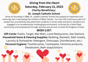 In our continued effort to meet the growing needs of the Tampa/Hillsborough County community, Sacred Heart is holding its latest Giving from the Heart drive-through donation event on Saturday, February 11, at the North Campus from 10 a.m. to noon. The February event is an effort of Sacred Heart’s Open Doors and Loving Hearts ministries. Volunteers from Open Doors will be collecting items on behalf of Mercy House, while Loving Hearts will be collecting for their Adopt-A-School beneficiary, St. Joseph Catholic School.