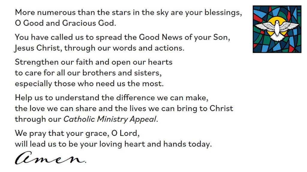 Gifts to the Catholic Ministry Appeal support the mission of Jesus Christ, allowing us to bring God’s love and mercy past our parish boundaries through ministries, programs and services provided by our local Church. These gifts are visible through so many of our own parish ministries and their volunteers, whose actions are done in love, both in service of our parish and our community at large. We ask that you join us over these next few weeks in prayerful consideration of this year’s Appeal, as we hear from the lay leaders, staff, and volunteers of our ministries on how you can assist their works, which again, are done in love.