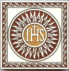 The tile shown here is likely close to the symbol that St. Bernadine used (although most likely without the cross raised above the “H”). This is the most common Christogram, denoting the first three letters of the Greek name of Jesus, iota-eta-sigma, or ΙΗΣ. The Greek letter iota is represented by I, and the eta by H, while the Greek letter sigma is represented by S.